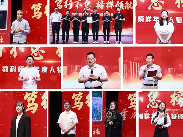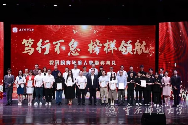 “教科榜样年度人物”旨在通过选树先进典型,大力宣传教育科学学院优秀师生在教学、科研、成长成才等方面涌现出来的先进事迹和感人事例,营造凝心聚力、团结奋进、昂扬向上的良好氛围,激励全院师生员工奋勇前行。首届颁奖典礼以“笃行不怠 榜样领航”为主题,对2022-2023学年度的10名教科榜样进行了表彰,他们分别是:国家万人计划教学名师申仁洪、重庆英才创新领军人才冉亚辉、科研成绩突出的青年教师全晓洁、指导学生屡获大奖的一线教师陈林、全面发展成功保研的2019级学前教育专业高芷灵同学、志愿服务彰显担当的2019级应用心理学专业宋志健同学、获川渝师范生专业技能大赛一等奖的2019级教育学专业唐钰颖同学、立志特殊教育事业推免至华东师范大学的2019级特殊教育专业许梦楠同学、科研成绩突出的2020级研究生齐锦涛同学,荣获第八届中国国际“互联网+”大学生创新创业大赛重庆赛区金奖的译心手语翻译团队。