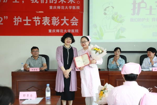 表彰环节,校领导为校医院“5.12”护理技能大比武、优秀护士及最佳贡献奖获得者颁发奖状。
