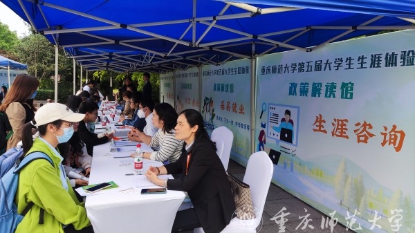 开幕式后,“户外主题日体验”活动正式开始。主题日共分为游戏体验区、朋辈分享苑和政策咨询馆三个主题活动区。游戏体验区设置了“职业猜猜看”“职场趣配”等原创职业体验游戏,让同学们在参与中丰富职业信息、提升自我认知、强化生涯规划意识。在朋辈分享苑,高年级优秀学子与同学们交流经验、答疑解惑、分享成长;在政策咨询馆,市就业中心及校内相关职能部门的老师针对选调生、特岗教师、三支一扶、西部计划、参军、创业等方面为同学们开展政策解读与生涯咨询。