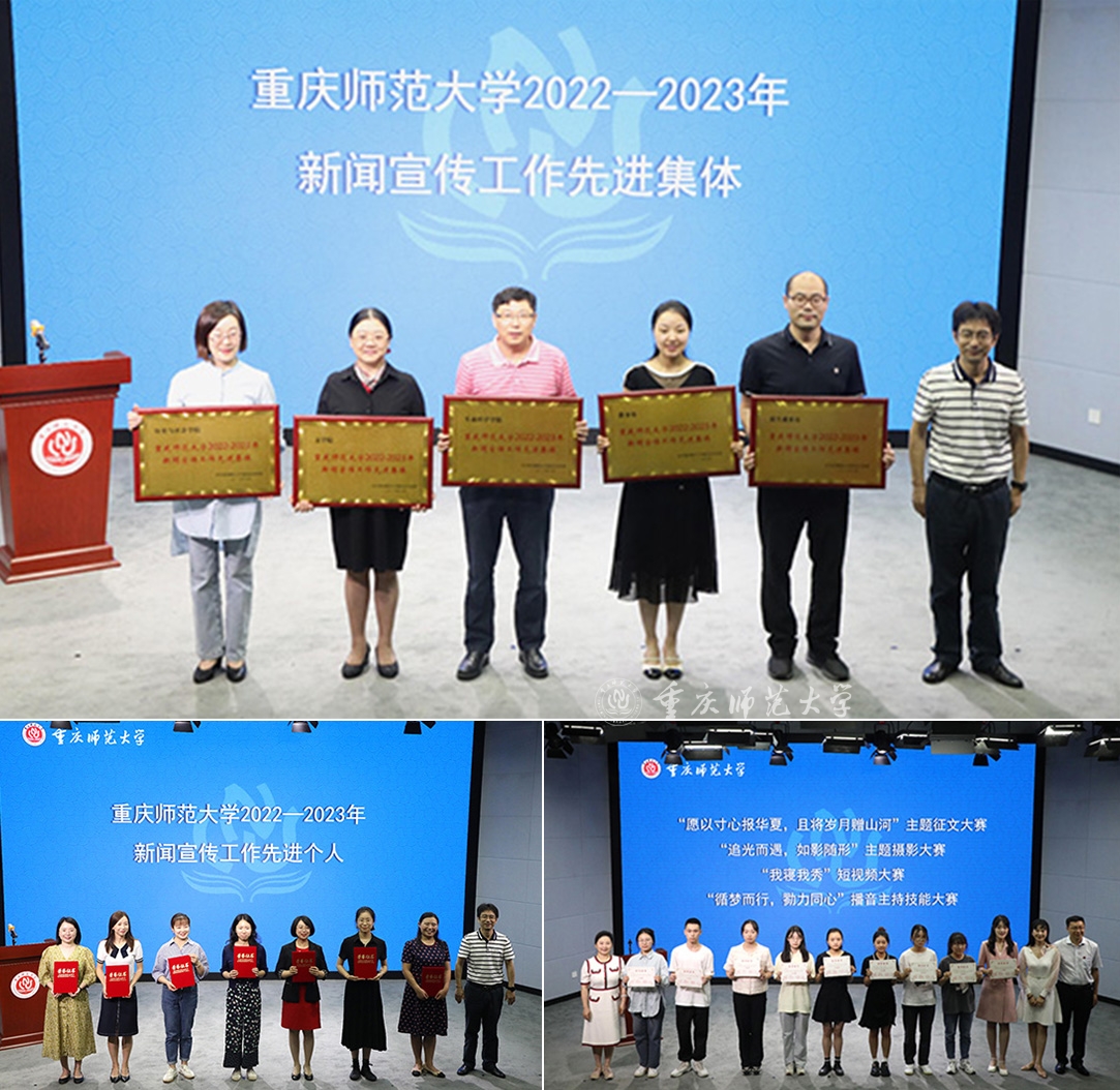 颁奖环节,陆远权上台为beat365在线体育官网登录入口2022—2023年新闻宣传工作先进集体和先进个人颁奖,与会职能部门负责人为第二十三届新闻宣传活动月获奖学生代表颁奖。获奖师生代表在分享获奖感言时纷纷表示,将继续提升做好新闻宣传工作的“脚力、眼力、脑力、笔力”,为讲好重师故事、传播好重师声音、展示好重师形象作出新的贡献。