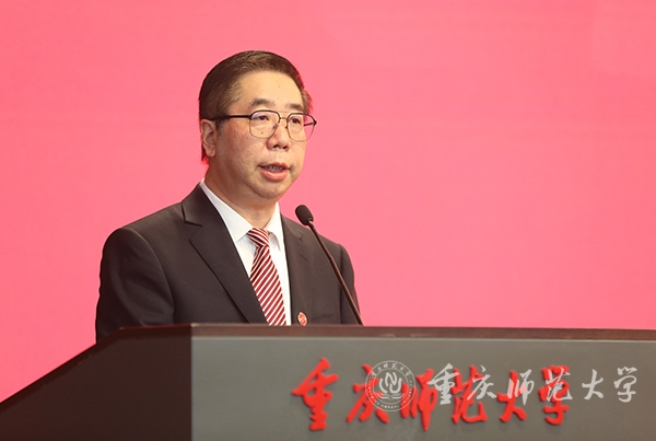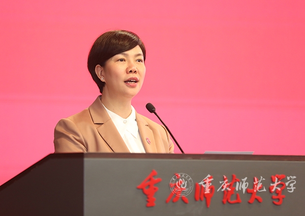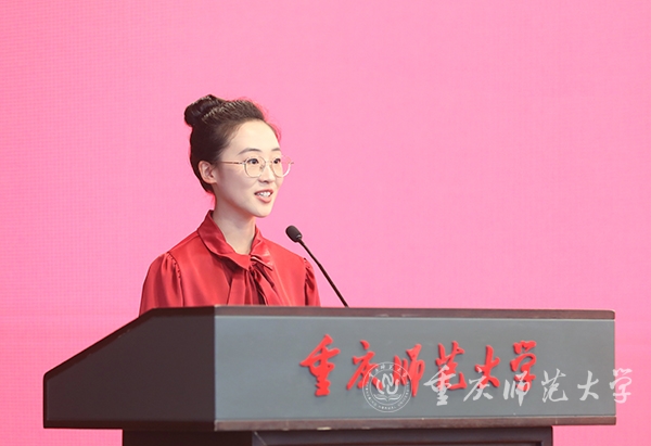 学生代表、文学院2020级汉语言文学师范专业张茜同学在发言中谈到,校园内,老师们躬耕不辍,矢志为党育人、为国育才;校园外,重师学子或躬耕三尺讲台,扎根教育事业;或驰骋科研舞台,成就学术理想;或致力经济、社会发展,成为行业精英。无论身在何方,重师学子始终用自己的不懈奋斗为党和国家贡献着重师力量。