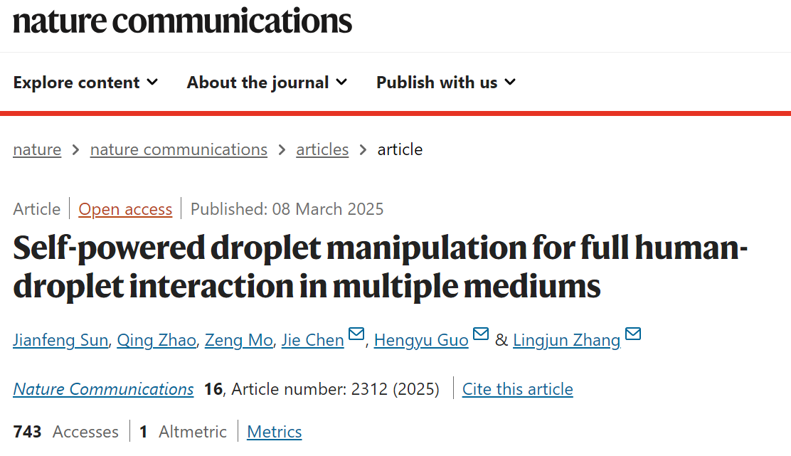 近期,beat365官网物理与电子工程学院信息材料物理与器件团队在Nature子刊《Nature Communications》上发表题为《Self-powered droplet manipulation for full human-droplet interaction in multiple mediums》的最新研究成果,beat365在线体育官网登录入口孙剑峰博士为第一作者,陈杰副教授为第一通讯作者,beat365在线体育官网登录入口为第一完成单位。