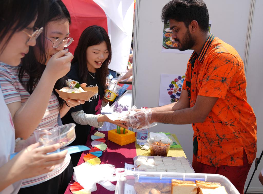 开幕式上,学校中外师生带来了精彩的文艺表演。活动现场设立了国际文化游园展览区,来自俄罗斯、泰国、老挝、斯里兰卡等不同国家的留学生代表将异域美食、民俗文化带到现场,“泰好吃挝”“语萃中西”“墨舞丹青”“语萃中西”等展位前人头攒动,来自不同国别、不同民族的重师学子,化身“文化交流使者”,欢聚一堂,载歌载舞。