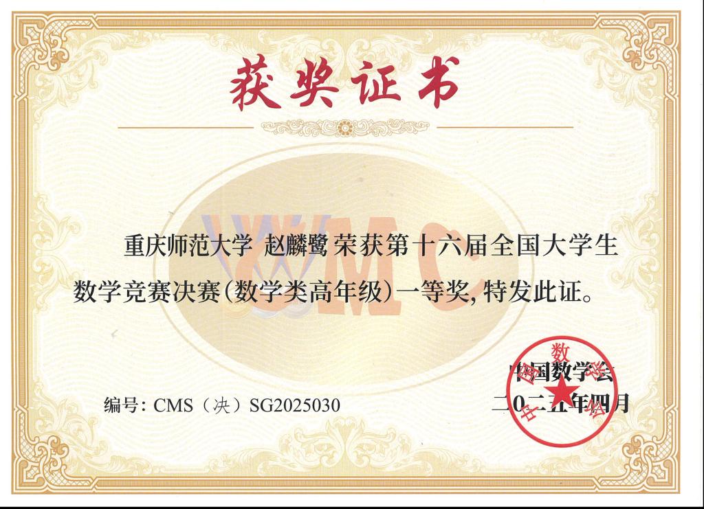近日,beat365官网学子在第十六届全国大学生数学竞赛决赛中斩获6个个人奖项,其中数学科学学院2021级数学与应用数学专业赵麟鹭同学获数学类高年级组全国一等奖。这也是继去年学校获得全国大学生数学竞赛决赛一等奖以后再次获此殊荣。
