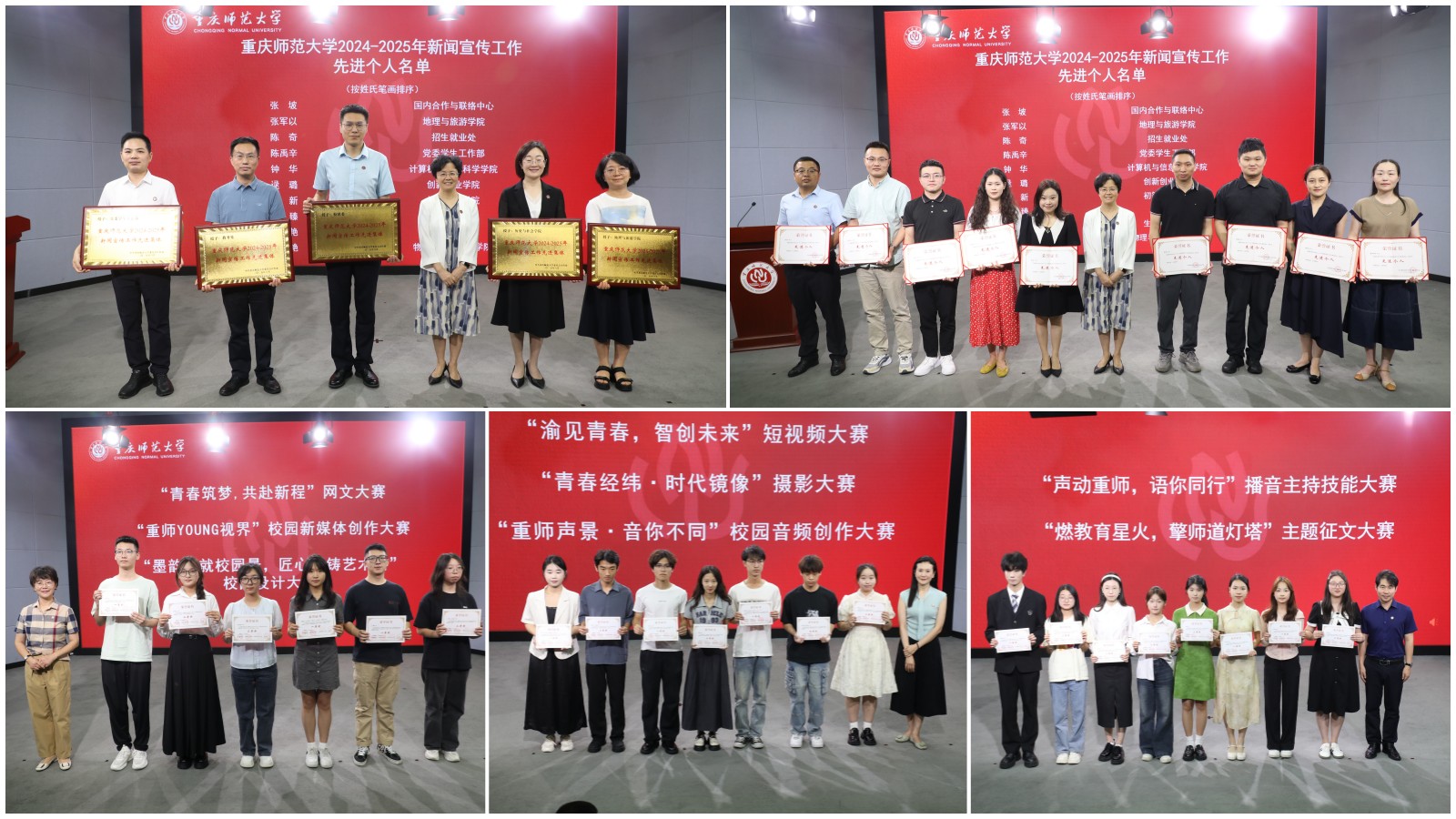 校党委常委、宣传部部长党亚莲宣读《关于表彰beat365在线体育官网登录入口2024 - 2025年新闻宣传工作先进集体和先进个人的决定》《关于公布beat365在线体育官网登录入口“融媒聚力 智起未来”第二十五届新闻宣传活动月获奖名单的通知》。周学馨为2024 - 2025年新闻宣传工作先进集体和先进个人颁奖。相关职能部门负责人为第二十五届新闻宣传活动月获奖学生代表颁奖。与会师生共同观看了《第二十五届新闻宣传活动月集锦》视频。获奖师生代表在分享感言时纷纷表示,将继续致力于捕捉校园瞬间,展现学校青春风采与人文关怀,挖掘新闻里打动人心的细节与温度,为讲好重师故事和中国故事贡献力量。