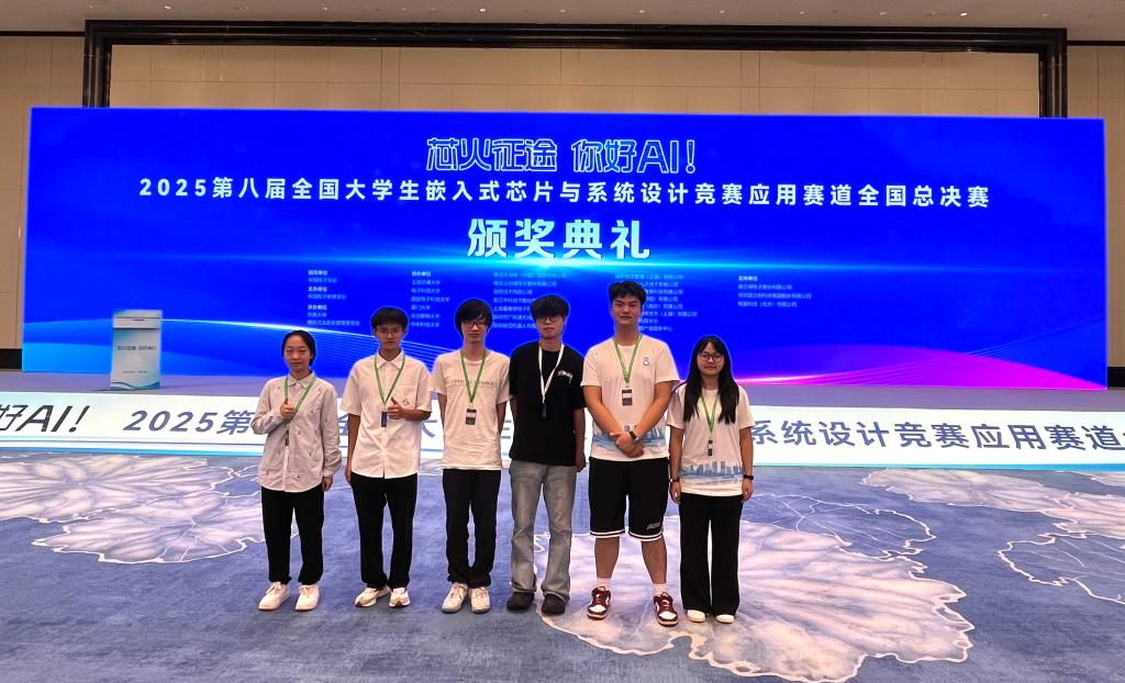 近日,2025 年第八届全国大学生嵌入式芯片与系统设计竞赛落下帷幕。本届芯片应用赛道以 “芯火征途,你好 AI” 为主题,共设有 ST、海思、沁恒、广和通、龙芯、RT-Thread 等 13 个赛题,吸引了来自全国 735 所院校的 11800 支队伍、32388 名学生参赛,通过六个分赛区线下复赛评审,评选出来自 326 所高校的 1077 支队伍晋级全国总决赛。beat365官网物理与电子工程学院推荐的 23 支参赛队伍表现亮眼,11支队伍在西南赛区获奖(5个一等奖、1个二等奖、5个三等奖),其中5支晋级全国总决赛的队伍最终斩获4个全国二等奖和1个全国三等奖,学校荣获“优秀组织奖”。