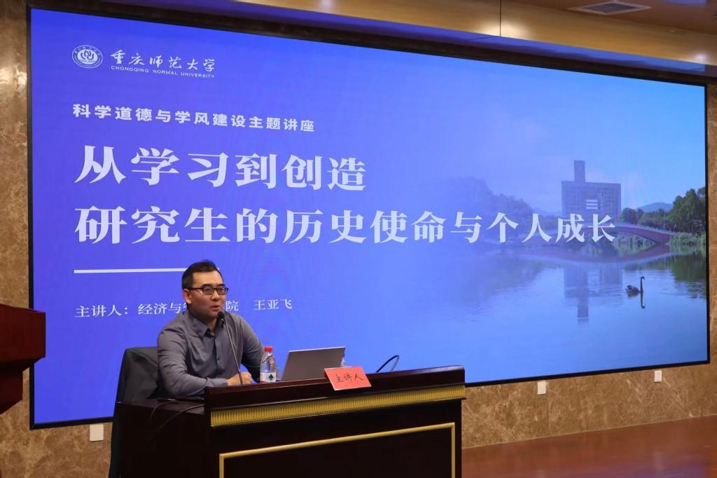 开幕式后,经济与管理学院硕士生导师王亚飞教授作题为“研究生的历史使命与个人成长”的科学道德和学风建设宣讲报告,他从“科研的重要性”出发,深入阐述了研究生在新时代下的使命与担当,并通过详实的案例与方法梳理,帮助我们更清晰地理解了如何开展严谨、创新的科学研究,尤其是“问题驱动”的研究思维与跨学科融合的重要性。