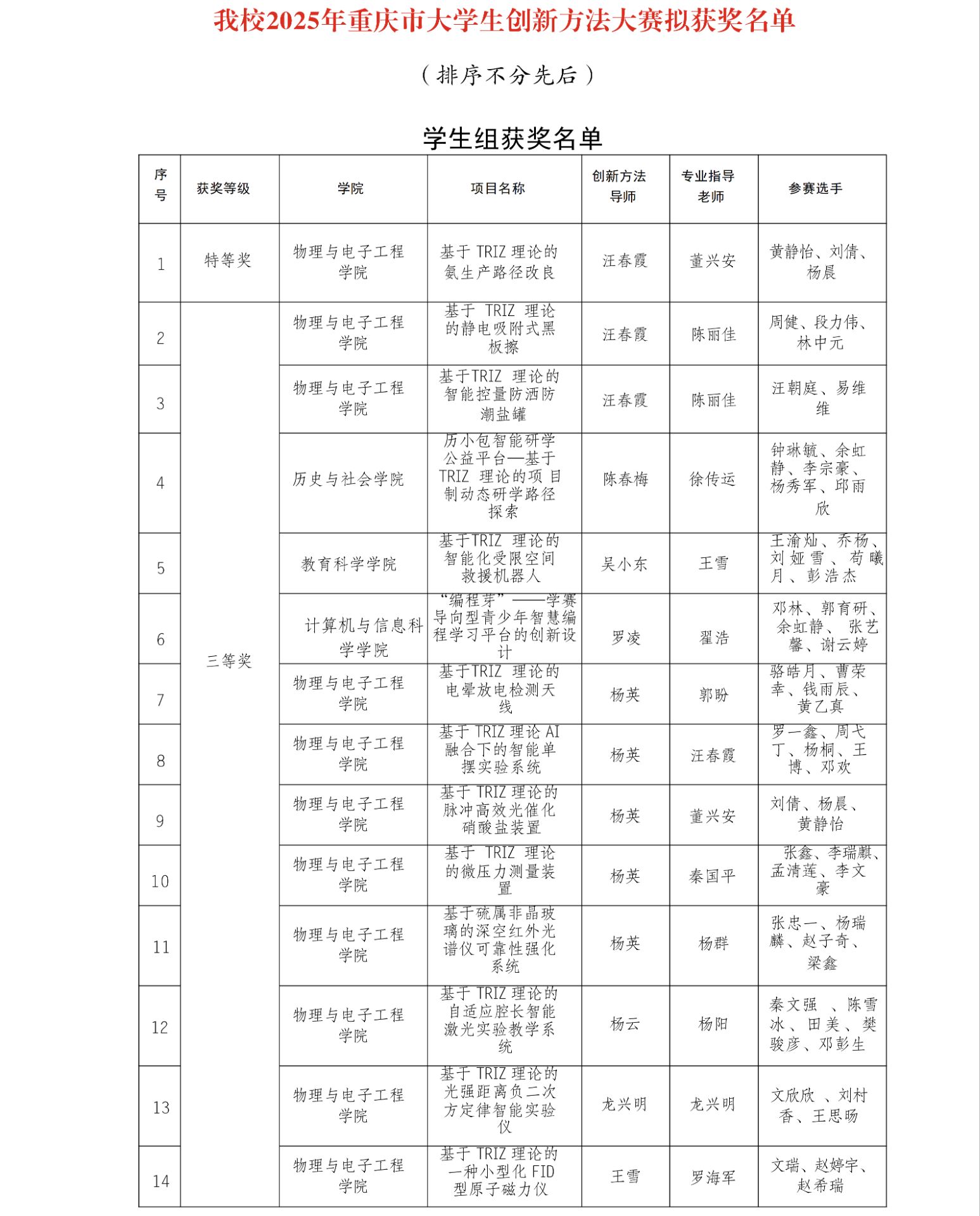 近日,由重庆市科学技术协会、重庆市教育委员会、重庆市科学技术局等单位联合主办的“2025年重庆市大学生创新方法大赛”在重庆航天职业技术学院落幕。经过激烈角逐,beat365官网参赛团队从全市795个参赛项目中脱颖而出,荣获学生组特等奖1项、三等奖13项。物理与电子工程学院汪春霞老师作为教师组代表进行了现场授课展示,并荣获了“创新方法成果奖”。