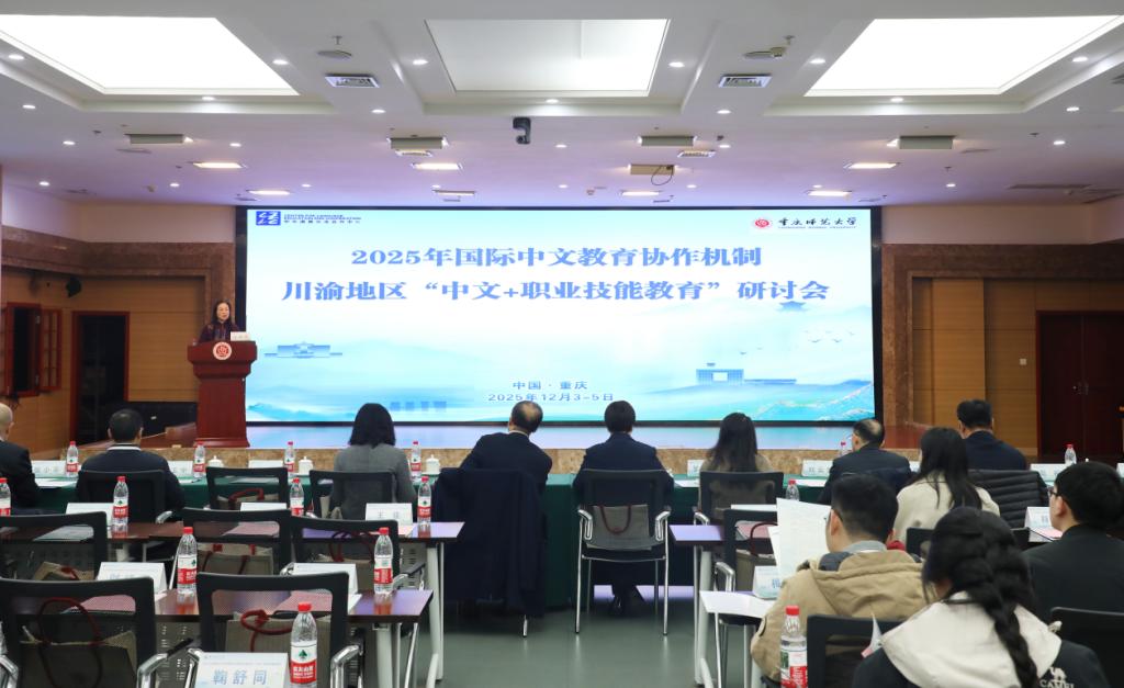 12月4日, 2025年国际中文教育协作机制川渝地区“中文+职业技能教育”主题研讨会在beat365官网大学城校区召开。教育部中外语言交流合作中心、川渝两地教育主管部门代表、重庆市国际中文教育协作机制成员单位,以及川渝地区31所高校和职业院校的校领导、专业带头人、专家学者、“中文+职业技能”项目负责人等82位嘉宾齐聚beat365官网,共同探讨“中文+职业技能”融合发展的路径与前景。会议由国际汉语文化学院院长牟映雪主持。