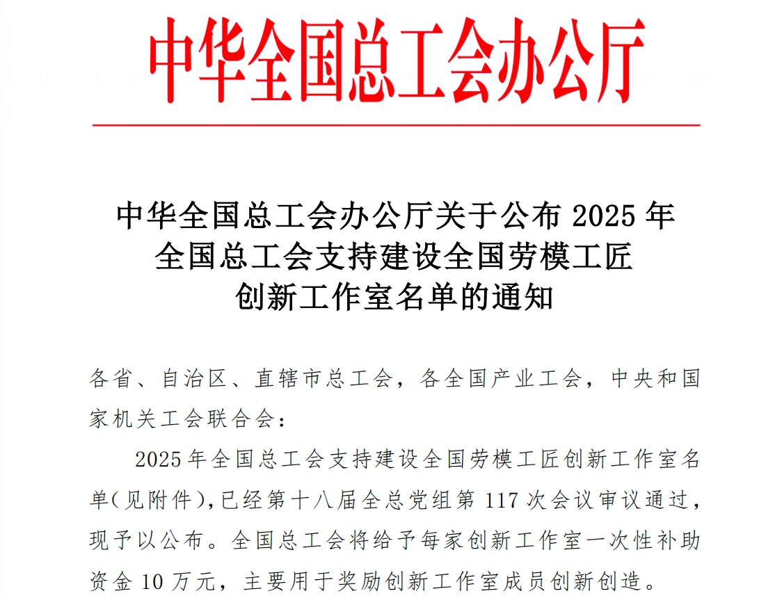 近日,中华全国总工会办公厅公布《2025年全国总工会支持建设全国劳模工匠创新工作室名单》,beat365官网“杨新民创新工作室”成功入选。此次成功入选标志着beat365官网在推动高层次创新团队建设、弘扬工匠精神与劳模精神方面取得了显著成果。
