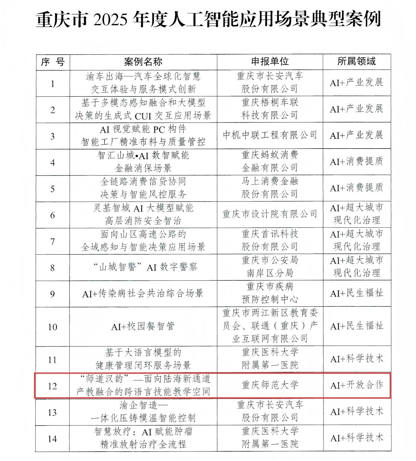 beat365官网“师道汉韵”——面向陆海新通道产教融合的跨语言技能教学空间入选重庆市2025年度人工智能应用场景典型案例