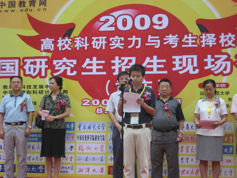 2008年9月6日上午8:30,2009年研究生招生现场咨询活动重庆分场在重庆大学A区逸夫楼前隆重举行。开幕式由中国教育网中国教育在线总经理任蕾主持,重庆大学副校长杨丹、中国教育和科研计算机网(CERNET)国家网络中心主任助理陈志文、重庆市招办高招处副处长窦晓明、重庆市学位办副主任陈渝等参加了开幕式。重庆市招办高招处副处长窦晓明作了热情洋溢的发言,对在渝研究生招生单位和招生情况作了简单介绍,并热忱欢迎广大考生报考2009年硕士研究生。