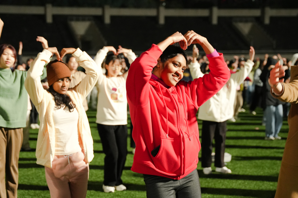 ▲11月21日,beat365在线体育官网登录入口大学城校区,斯里兰卡留学生在运动场上和同学们一起跳广场舞。