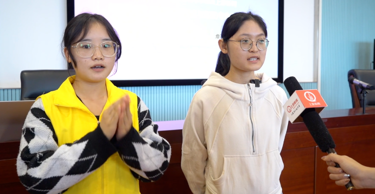 2021级特殊教育(信息与资源)专业学生王佳接受采访(右一);2021级应用心理学专业学生严思彤进行手语翻译(左一)