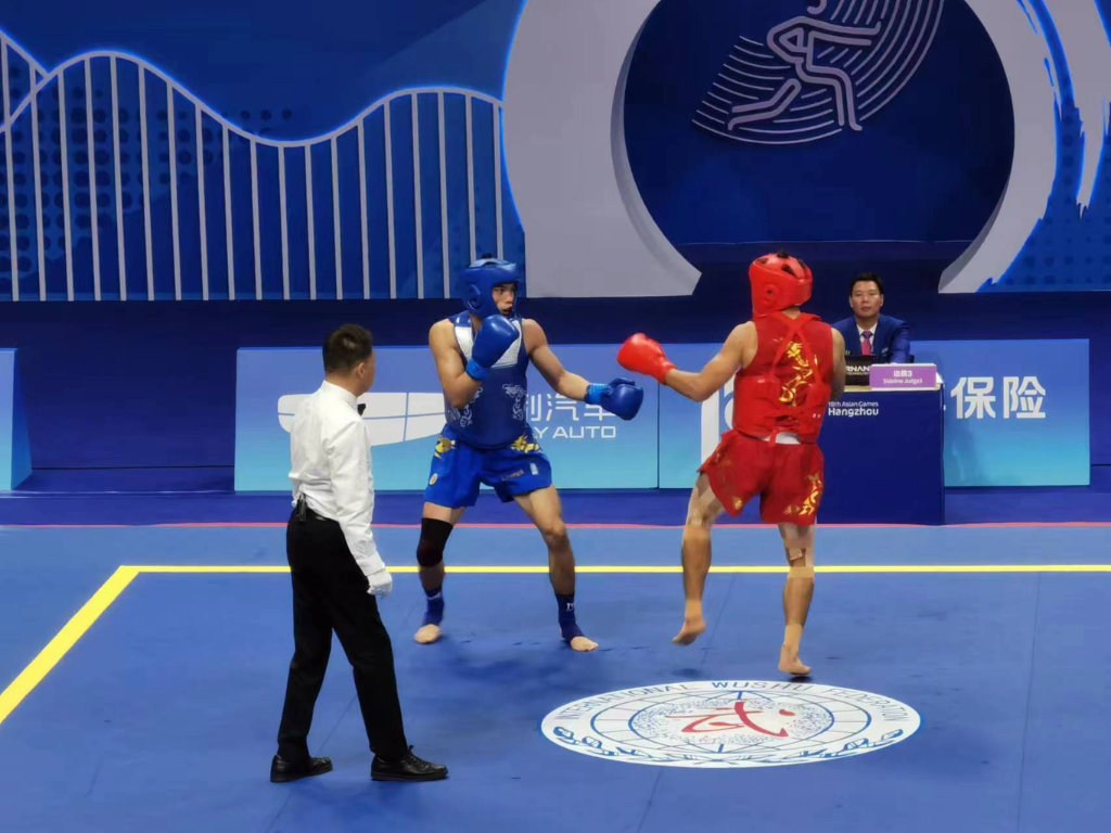 晚间,萧山瓜沥文体中心,何烽全力出击,在武术散打70公斤级的比赛中战胜越南选手阮文才,顺利晋级将于9月26日进行的1/4决赛。