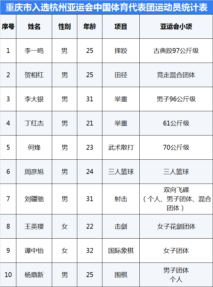 入选的10名重庆运动员