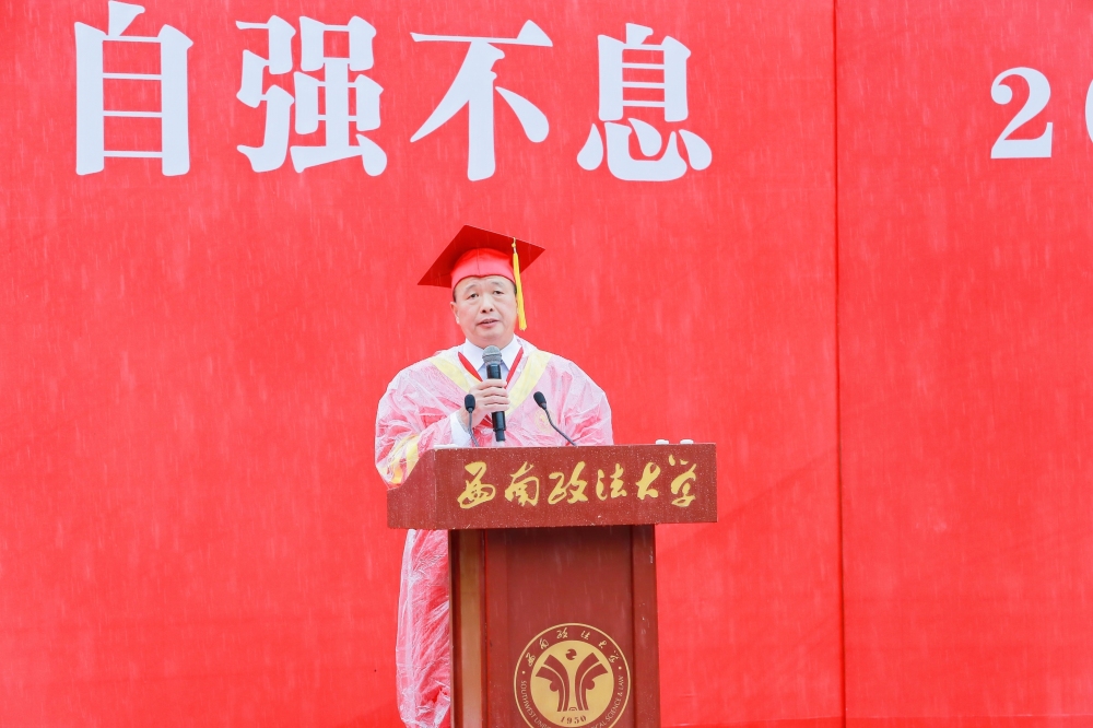 6月21日上午,西南政法大学冒雨举行2023届学生毕业典礼暨授位仪式。不忍师生们在雨中苦站,校长付子堂把原本3500多字的致辞精简成为600多字的简短发言。