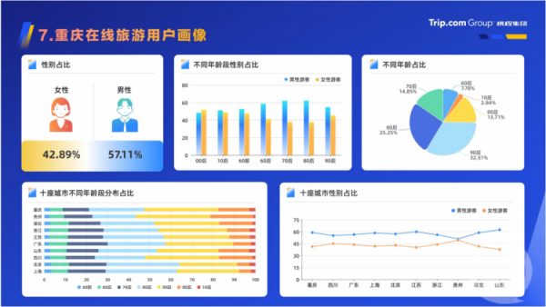 其中,来渝旅游的90后最多,占比32.51%,80后其次,占比25.25%。男性游客人数占比57.11%,高于女性游客人数。