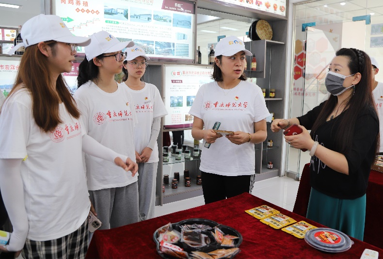 “传统工艺,科学管理,质量保证,追求创新”,在重庆市宏霖食品股份有限公司,负责人谭红梅带领志愿者们走进产品展销中心了解产业概况。交流会上,谭红梅表示,作为第二产业中的加工业,由于地理位置与交通运输等原因,宏霖食品面临着缺乏专业人才与技术人员的难题。就此,实践团指导老师张珍瑜向负责人介绍beat365在线体育官网登录入口食品安全等专业,并表示鼓励重师学子返乡就业、助力产业振兴。
