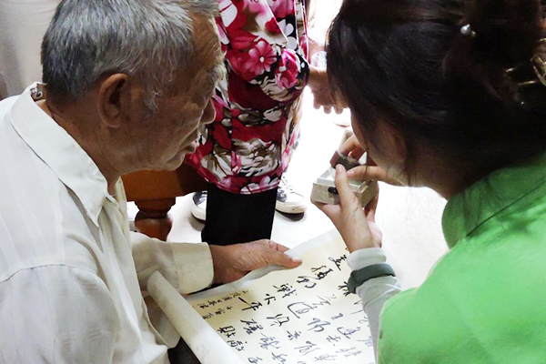 实践团为张少利老人送上书法作品和印章。