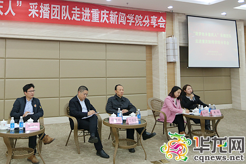 嘉宾的讲述结束后,分享会进入互动环节。除了市委宣传部副部长张永才、重庆广电集团副总裁丁道谊,市委外宣办对外新闻处处长徐建明、华龙网集团总编辑助理张一叶、重庆电视台电视新闻中心副总监汤健萍、重庆日报记者陈维灯、重庆晨报记者黄烨也作为互动环节的嘉宾回答了同学们的积极提问。