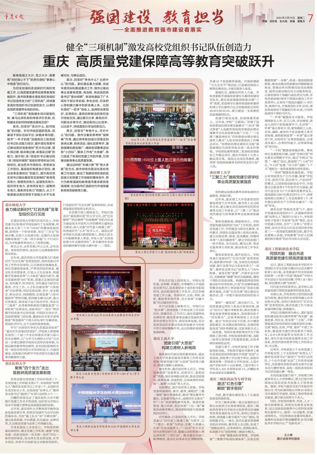 作为“全国创先争优先进基层党组织”“重庆市先进基层党组织”,学校深入贯彻落实党的二十届三中全会和重庆市委六届六次全会精神,以“大学习大调研大讨论”方式进一步落实落细学校深化改革具体举措,为建设教师教育特色鲜明、具有国际影响的全国一流综合性师范大学而团结奋斗,为强国建设、民族复兴和谱写中国式现代化重庆篇章贡献重师力量。