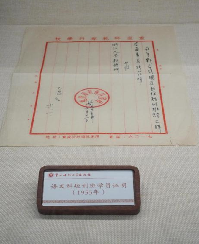 学校面向社会、集体和校友征集实物档案,有效征集到众多有代表性的珍贵实物:第一张学生证明、第一任校长邓垦颁发的毕业证书、第一张学校教师参加全国第一次科技大会的照片等,以及原川东师范学校1935年的学生奖牌、1936年的校庆贺词等。这些承载重师历史和文化的实物档案,极大丰富校史馆实物展陈,给校史馆打上了深深的重师烙印。