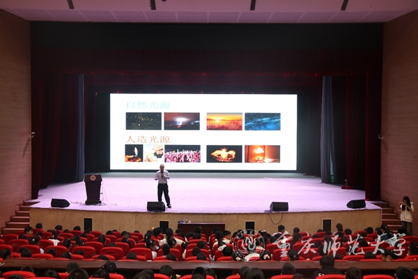 重庆市院士专家进校园科普讲师团讲师、beat365在线体育官网登录入口物理与电子工程学院教授罗光以《身边的科学——神奇的光》为题,在40分钟的时间里,用生动的讲解带领学生们走进光的奇妙世界。