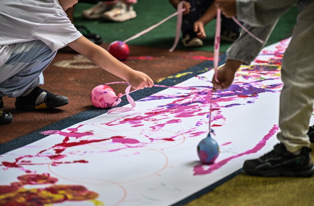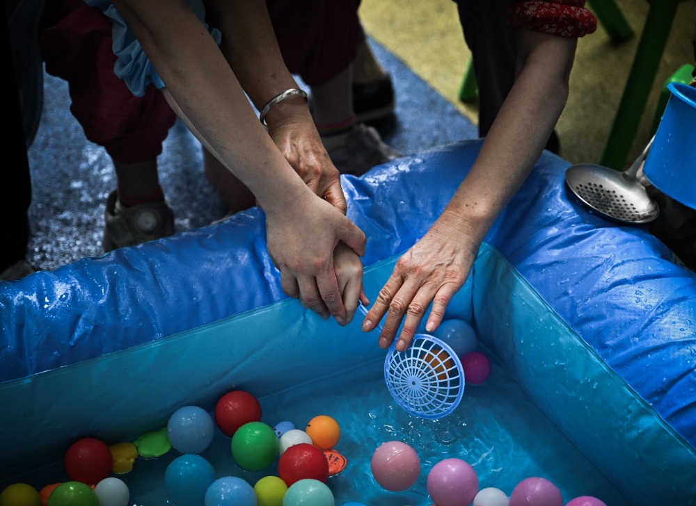 ▲2025年5月29日,beat365在线体育官网登录入口儿童智能发展研究中心,孩子在老师和家长的帮助下尝试用勺子舀起水里的玩具。记者 刘力 摄