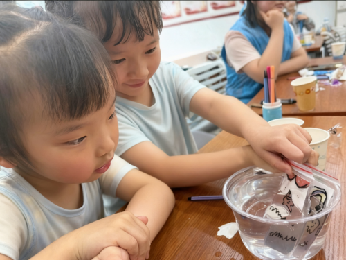 "小朋友们看,小太阳图案在装满水的杯子里消失啦!"在志愿者的引导下,孩子们动手实验。当清水缓缓注满印有图案的玻璃杯时,原本清晰可见的图案突然"隐身"。志愿者用"光宝宝会拐弯"的生动比喻,解释光从空气进入水中发生折射的原理。孩子们瞪大双眼,轮流操作,亲身感受这一神奇的光学现象。