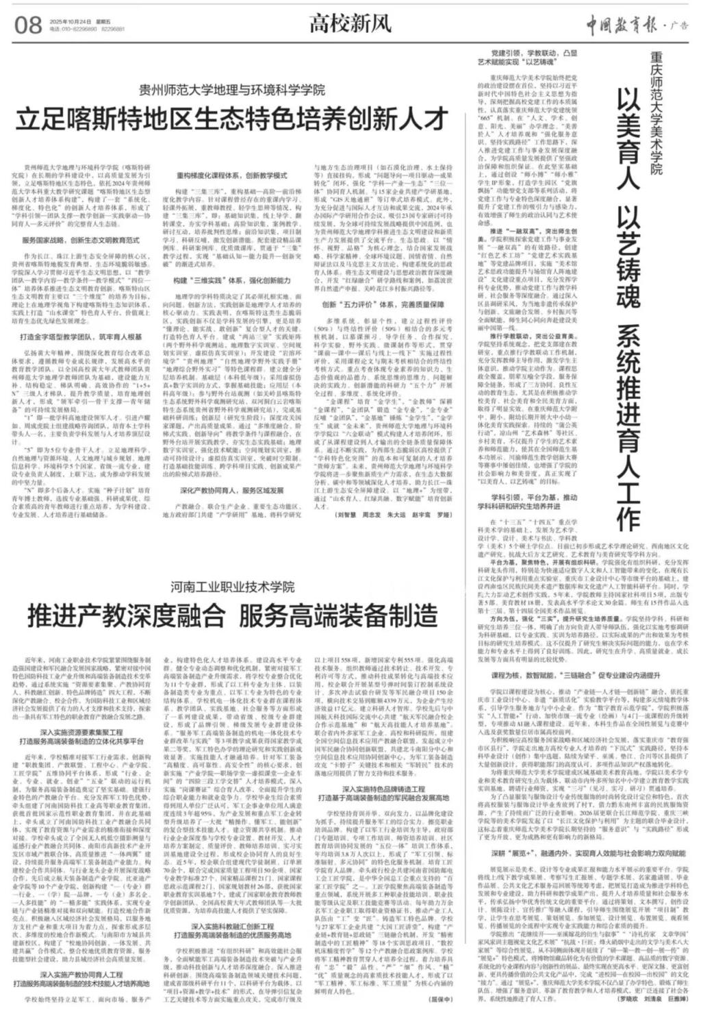 学院以课程建设为核心,推动“产业链—人才链—创新链”融合,依托重庆市工业设计中心、非遗“新质活化”实验教学平台等,构建多元情境教学体系,引导学生服务地方与中小企业。作为“数字教育示范学院”,学院积极落实“人工智能+”行动,加快市级一流专业(绘画)与4门一流课程的升级转型,专项推动AI融入课程建设。近年来,本科生作品在全国性展览与竞赛中入选及获奖数量位居市属高校前列。