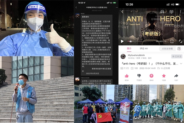 梁人义主动投身属地南岸区铜元局街道梨支园社区疫情防控,多次担任志愿登记员、采样员、搬运工,他时刻用朝气蓬勃的热情感染着周围的同事,同志愿者们一起把青春力量拧成一股绳,为辖区居民筑牢抗疫屏障。地理与旅游学院中共预备党员姚雨婷同学主动参与属地兰州疾控中心组织的培训,协助当地的核酸检测工作;“战衣”上身,一穿就是9小时,她用自己实际行动践行入党初心,努力做到“关键时刻站得出来、危急关头豁得出去”的优良作风。文学院党员黄巧丽同学在实习学校——重庆市育才中学校化身“大白”,同医护人员一起奋战在疫情阻击战的第一线。