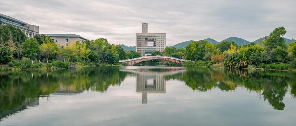 镜湖钟楼映山青